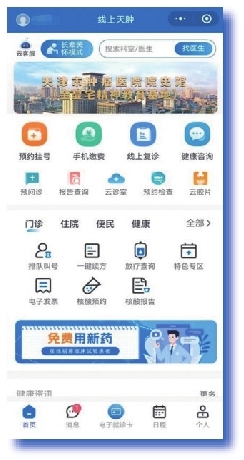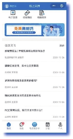 根据患者就医主要需求和点击量,调整互联网医院首屏常用服务功能,将预约挂号、手机缴费、线上复诊、健康咨询、报告查询等常用功能放到显著位置,一键触达就医服务。此外还将患者就医场景按照门诊、住院、便民、健康进行分类,方便不同就医场景的患者查找使用相关阶段的线上诊疗服务。