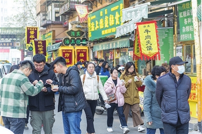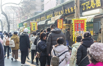 从清真南大寺的牌楼下进去,煎饼馃子、锅巴菜、卷圈、酱牛肉、茶汤……6:00刚过,早点铺和小吃店就迎来五湖四海的食客。在市井小街中,人们和着津味早点的热气和“主食卷主食”的调侃,道出了最真切的消费体验。