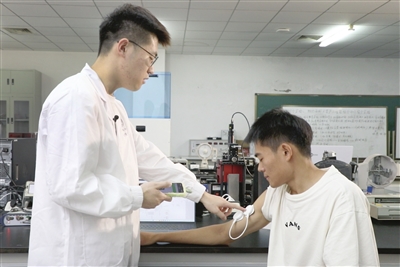 天津工业大学纺织学院智能可穿戴研究所刘皓教授团队研制的神经肌肉刺激仪,日前进入收尾阶段,可应用于缓解运动后肌肉疲劳、疼痛,改善睡眠质量等方面。 本报记者 姜宝成 通讯员 高泽宇 摄