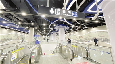 中交一航局天津地铁11号线12标项目经理部总工程师赵鑫介绍,环宇道站作为重点站,站内设计采用历史、现在和未来的可持续发展理念,通过换乘即能使乘客了解现代轨道交通的发展历程及趋势。记者在现场看到,11号线环宇道站呈工业风设计,站厅顶部设置清爽明快的线条灯,风格和地铁10号线环宇道站基本保持统一。