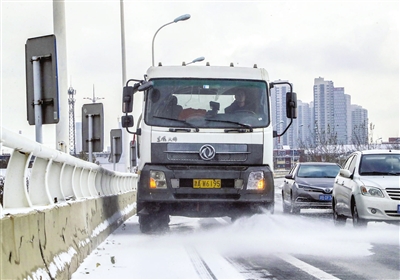 本报讯(记者 曲晴)记者获悉,全市环卫部门从昨日3时起,开始对桥梁和部分主干道路喷洒盐水,重点对地铁站、公交站、学校和医院门前等非机动车道、便道和过街天桥等地进行人工清雪作业,确保早高峰道路通行秩序正常。