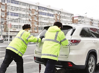 “路面湿滑,车辆行驶的不是很顺畅,就需要我们人为地断一下车流,尤其是右转乐园道的车辆,平时比较多,今天路滑,如果临近了再踩刹车,就比较危险,所以我们会示意车辆提前停车,同时提示行人快速通过路口。”伴随着车流量逐渐增多,辅警张琦从岗台上来到路口处疏导交通,防止集聚过多的车辆。