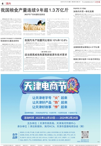 新华社北京12月11日电(记者 魏玉坤)国家统计局11日发布的数据显示,2023年全国粮食生产再获丰收,全年粮食产量再创历史新高。全国粮食总产量13908.2亿斤,比上年增加177.6亿斤,增长1.3%,连续9年稳定在1.3万亿斤以上。