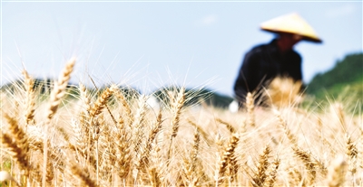 农民在贵州省高标准农田里收割小麦。 新华社发