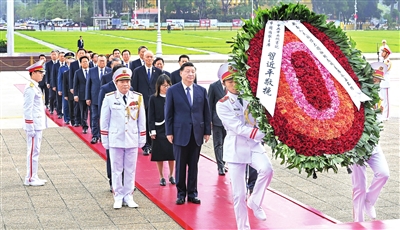 当地时间12月13日上午,中共中央总书记、国家主席习近平在河内瞻仰胡志明陵并敬献花圈。