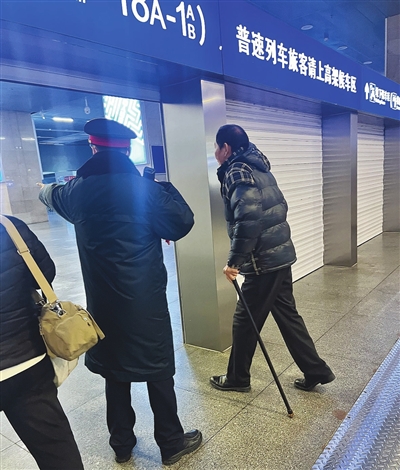 12月11日中午,记者再次乘地铁来到天津站,通过地下负一层赶往候车大厅,发现楼梯一旁站着两位身穿制服的工作人员,正在引导那些手推大件行李箱、携带轮椅或婴儿车及行动不便的旅客们,乘坐无障碍直梯通过车站的站台赶往候车大厅。“这位师傅,您跟我走,通过前方闸机口,左拐绕行乘直梯前往候车大厅。”一位架拐前行旅客被工作人员引导上了无障碍直梯。“抱小孩女士,您来这边通道。”“您这个行李箱太大了,绕行这边乘坐直梯。”在两位工作人员的引导下,此时的进站口秩序井然,有人走楼梯,有人被引往直梯。