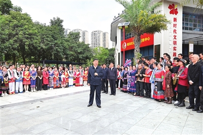 南宁市良庆区蟠龙社区是一个多民族聚居社区。习近平来到社区党群服务中心,听取现场工作人员关于开展主题教育、促进便民惠企、举办民族特色活动等情况介绍,对他们坚持党建引领聚合力、服务为本促发展的做法表示肯定。在文体活动室,他饶有兴致地观看社区居民习练书法、合唱民歌,同大家亲切交流,鼓励社区充分利用人才、场地等资源,开展更多健康有益、启智润心的文化活动,以此激发更大的正能量。习近平指出,社区是基层自治的基本单元,是国家治理体系的基层基础。通过社区这个平台,办好“一老一小”等民生实事和公共事务,积极回应群众关切,是中国特色基层治理的显著优势,要把这一优势发挥好。建设多民族群众互嵌式社区,是促进各族群众交往交流交融的重要途径。广西建设铸牢中华民族共同体意识示范区,要从基层社区抓起,通过扎实的社区建设、有效的社区服务、丰富的社区活动,营造各族人民一家亲的浓厚氛围,把民族团结搞得更好。
