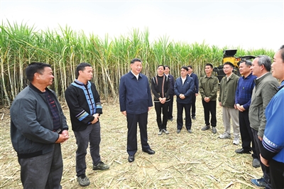14日下午,习近平到来宾市考察调研。在国家现代农业产业园黄安优质“双高”糖料蔗基地,习近平察看万亩甘蔗林和机械化作业收割场景,听取基地情况介绍。他走进甘蔗林,详细了解甘蔗良种繁育技术要领,同蔗农、农机手和农技人员亲切交流。习近平指出,广西是我国蔗糖主产区,要把这一特色优势产业做强做大,为保障国家糖业安全、促进蔗农增收致富发挥更大作用。要积极培育和推广良种、提高机械化作业水平,建设好现代农业产业园。要探索建立更加稳定的利益联结机制,让广大农民共享农村改革和发展成果。他祝愿乡亲们的生活像甘蔗一样甜蜜。