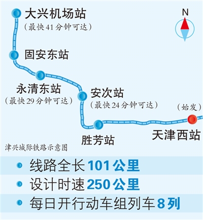 津兴城际铁路起自天津西站,途经天津市红桥区、河北省廊坊市、北京市大兴区,接入大兴机场站,线路全长101公里,其中全长47公里的胜芳至固安东段为新建线路,设计时速250公里。全线共设天津西站、胜芳站、安次站、永清东站、固安东站和大兴机场站6座车站,其中安次站和永清东站为新建车站。