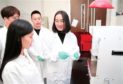 天津大学环境科学与工程学院特聘研究员、博士生导师赵迎新(右一)与团队致力于构建微生物增材制造(3D打印)活性材料研究。 本报记者 姜宝成 摄