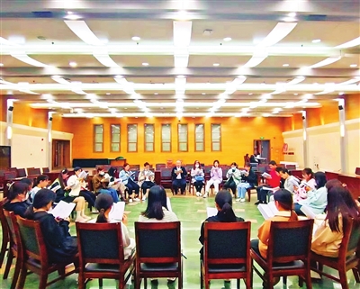 天津医科大学心理咨询健康中心教师李建伟带领学生进行“晨丹诗歌同化自愈疗法”。