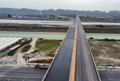 乐山市省道215线大件过境公路项目全长17.749公里,项目按照“分段建设、分段交工、分段付费”原则分4段建设,其中苏沙路至安谷互通段长3.3公里。12月15日,由中铁十八局集团承建的该段范围内重难点工程大渡河特大桥完成沥青铺筑,为苏沙路至安谷互通段年底通车打下坚实基础。(李红英)