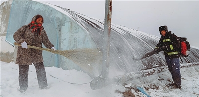 应对寒潮,保障农业生产安全,张家窝镇农业园区及时组织清扫棚顶积雪,减轻温室大棚承重压力。