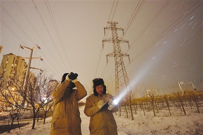 天津送变电公司线路运维人员在雪中对电厂并网线进行夜间特巡工作,保障电网供电安全,确保百姓温暖过冬。