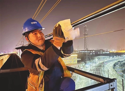 天津轨道交通运营集团接触网维修人员,连夜为地铁9号线露天段的接触网涂抹防冻液,保障列车安全平稳运营。