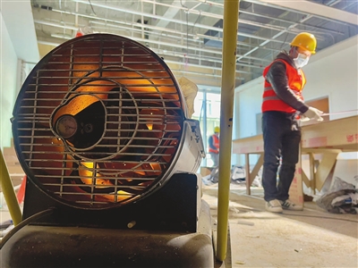 中建三局华北公司施工人员在人民医院扩建项目采用暖风机为建筑材料进行升温,确保低温下正常使用。