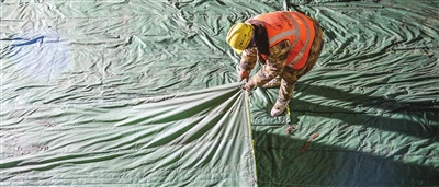 地铁8号线工地上,工作人员正在铺设“保温被”,确保低温下工程质量稳定可靠。