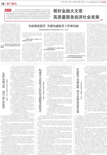 金融是国民经济的血脉,是国家核心竞争力的重要组成部分。为深入学习贯彻中央经济工作会议和中央金融工作会议精神,坚定不移走中国特色金融发展之路,本报约请国家金融监督管理总局天津监管局负责人,以及中央金融机构驻津单位、天津金融机构负责人,聚焦全面强化金融监管工作,畅谈如何做好科技金融、绿色金融、普惠金融、养老金融、数字金融五篇大文章,如何做优产业金融、航运金融等天津特色金融,致力于金融高质量发展的实践创新,服务全市经济社会高质量发展,推动金融创新运营示范区建设。本报《津门策论》版将陆续推出系列专版,敬请垂注。