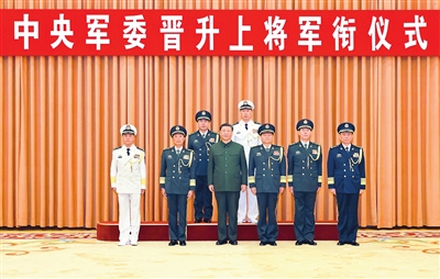晋衔仪式在嘹亮的军歌声中结束。随后,习近平等领导同志同晋升上将军衔的军官合影。