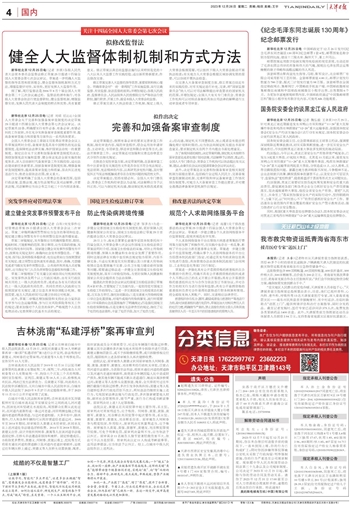 新华社北京12月25日电(记者 齐琪)各级人民代表大会常务委员会监督法修正草案25日提请十四届全国人大常委会第七次会议审议。草案进一步明确人大监督的指导思想和原则理念,健全监督体制机制和方式方法,增强监督针对性、实效性,更好发挥人大监督作用。