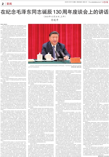 12月26日,中共中央在北京人民大会堂举行纪念毛泽东同志诞辰130周年座谈会。中共中央总书记、国家主席、中央军委主席习近平发表重要讲话。 新华社记者 谢环驰 摄