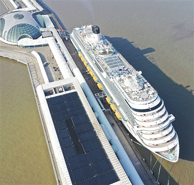 图为“爱达·魔都号”停靠在上海吴淞口国际邮轮港(无人机照片)。