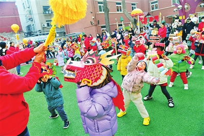 河北一幼的小朋友们用舞龙表演迎接2024新年的到来。 本报记者 胡凌云 摄