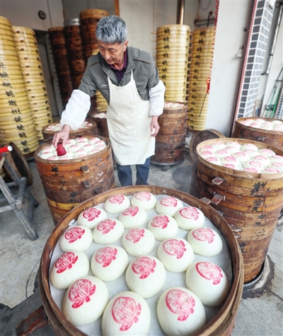 1月3日,在浙江省金华市金东区赤松镇二仙桥村,65岁的姚国宪在给蒸好的馒头盖上传统红印。金华红印馒头以酒酿发酵制作,是当地逢年过节、操办喜事宴席的传统美食。 新华社发