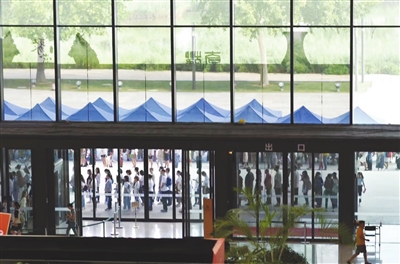 暑假,天津博物馆周末日客流量破万。工作人员在门前建起长达百米的遮阳凉棚。