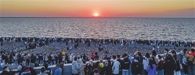 “五一”假期,不少游客来到滨海新区东疆亲海公园,沐浴清晨的第一缕阳光。