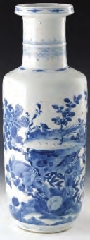 清康熙青花雉鸡牡丹图棒槌瓶。