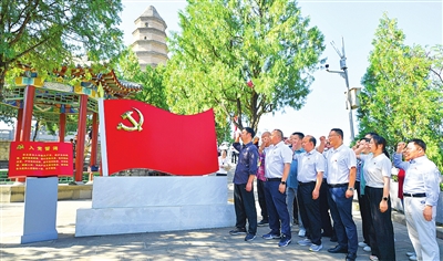 2023年6月30日,在陕西延安宝塔山参观的党员干部重温入党誓词。 新华社发