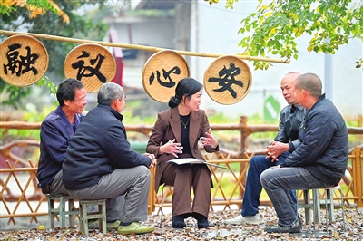 2024年1月5日,在广西融安县浮石镇六寮村议事协商主题广场,镇、村干部和村民在议事。新华社发