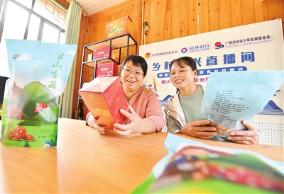 2023年10月8日,在广西柳州市融水苗族自治县安陲乡江门村,村干部带领同事在乡村振兴直播间准备直播工作。新华社发