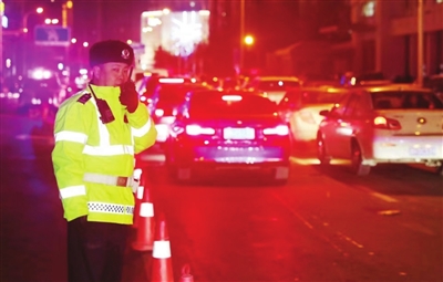 2023年12月31日晚,“鼓楼·津声”跨年活动开始前,交警南开支队南马路大队大队长刘腾显在临时交通管制区域执勤。