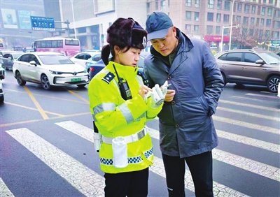 2024年1月1日上午,交警红桥支队新红桥大队交警王馨在西北角周边路口为群众指路。