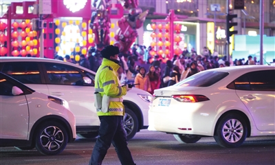 2023年12月31日跨年夜,交警和平支队贵州路大队辅警甄诚在南京路与营口道交口,疏导往来车辆,保障游客出行安全畅通。