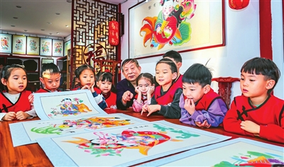 昨日,西青区杨柳青镇书香门第幼儿园的小朋友来到杨柳青古镇玉成号画庄,听国家级非遗传承人霍庆顺解读年画历史,体验传统文化魅力。