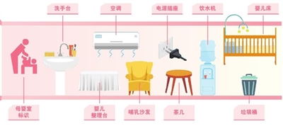 2016年11月,原国家卫生计生委等10部委发布《关于加快推进母婴设施建设的指导意见》,规定公共场所母婴设施基本配置应包括:面积一般不低于10平方米;防滑地面;带安全扣的婴儿尿布台;提供热水和洗手液的洗手台;婴儿床;便于哺乳休息的座椅;便于放置哺乳有关用品的桌子;电源插座;垃圾桶;保护哺乳私密性可上锁的门、帘子遮挡设备等。