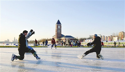 1月7日,天津市海河冰雪嘉年华在天津海河水上运动中心开幕。10000平方米天然冰场、4000平方米人造雪场向市民开放。