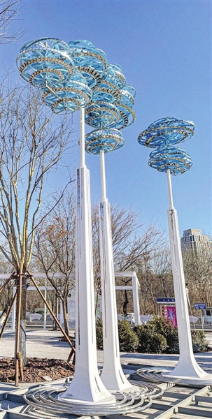 其中,由天津美术学院教授景育民创作的动态装置艺术作品《行云流水》,利用空气动力学原理结合不锈钢材料,打造出了高天流云、水波荡漾的空间意象。微风习习、行云飘逸,装置随着风力的变化婉转运行,改变着自己的形态。作品不仅为这个街区引入了诗意与浪漫的气息,也成为海河畔一道充满时代风尚和美学品质的新风景。