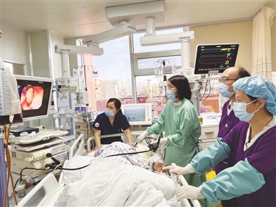 医生们在为张大娘进行急诊胃镜检查治疗。 摄影 梁静
