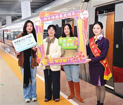 旅客与乘务员在杭州西站与G3073次高铁列车合影。 新华社发