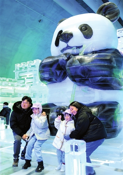 近日,韩国江原道华川郡举行山鳟鱼节,人们可在现场体验冰钓、滑冰、冰滑梯等丰富多彩的冰雪活动。主办方还邀请了来自哈尔滨的工匠为冰灯广场创作冰雕艺术品,吸引众多游客慕名而来。图为1月13日,在韩国江原道的华川山鳟鱼节现场,游客在哈尔滨工匠制作的大熊猫冰雕作品前留影。 新华社发