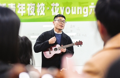 图为近日在武汉市汉阳区四新街道梅林都汇社区二楼共享自习室,教师汪阔林在教授尤克里里。