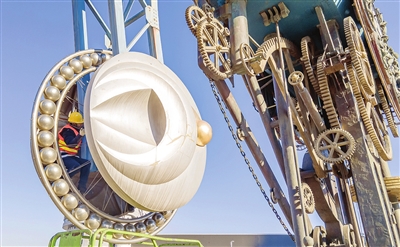 走进世纪钟广场,顺着台阶走上平台,抬头仰望,这座高40米的世纪钟雕塑底座上布满了大小齿轮和链条,巨大的螺钉、铆钉与不远处的解放桥相互辉映。表盘侧面巨大的钟摆造型通过S形摆架,上顶太阳轮、下挂月亮轮。目前,世纪钟基座周围立起了一圈围栏,围栏内,两名工作人员正通过升降机在月亮轮上作业。
