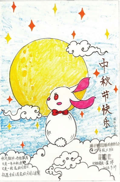 虽素未谋面,但李佳尹从画作里就能感受到小喜在进行美术创作时的认真:“这是一幅中秋主题的画。我拿到画时,第一感觉就是这幅画细节处理得很好,比如小兔子的眼睫毛、耳朵以及月亮表面坑坑洼洼的效果,都能看得出来她花了不少工夫。还有从色彩上来看,她创作的时候应该很开心。”