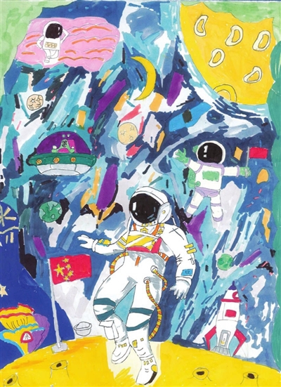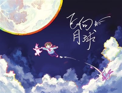 小喜的画只有一只可爱的兔子和月亮,李佳尹在二次创作中加入了小女孩自己的卡通形象,穿着校服、戴着眼镜、扎着双马尾的小姑娘与好朋友小兔子手拉着手,在深邃的太空中翱翔,向着月亮的方向飞去。李佳尹给这幅二创作品起名为《飞向月球》,并绘制了一张送给小喜的祝福卡片,上面写着:希君生羽翼,一化北溟鱼。