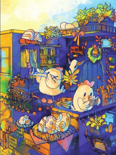 与韦晓颖结对的是一对姐弟,似乎是基因里有着绘画天赋,这对姐弟的画作表达内容比较完整、色彩丰富,在韦晓颖看来是那种装饰性较强的儿童画,有种“可以直接摆起来欣赏”的感觉,她说:“我有幸‘抢’到了两幅童画进行二次创作。第一幅画的内容是冰淇淋,我觉得原作平面构成感很强,表达得也很直观——就是想要好吃的,过上一种甜蜜的生活。所以我在二创过程中就把这种心愿拟人化,将冰淇淋与夏天、游泳等元素结合,表现出一种童趣和快乐。第二幅画画的是小鸡,原画里的小鸡很多,有一种‘家族感’,所以我在二创时以一栋房子为载体,把这种感觉具象化了。完成两幅画时,我觉得很有成就感,因为在做公益的同时我的专业能力也得到了锻炼。”