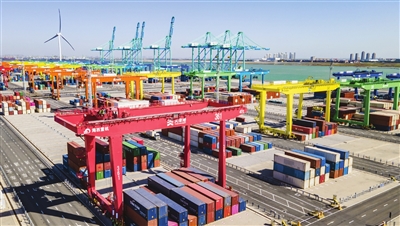 天津港北疆港区C段智能化集装箱码头,作为全球首个“智慧零碳”码头,集装箱吞吐量破100万标准箱。 本报记者 吴迪 摄